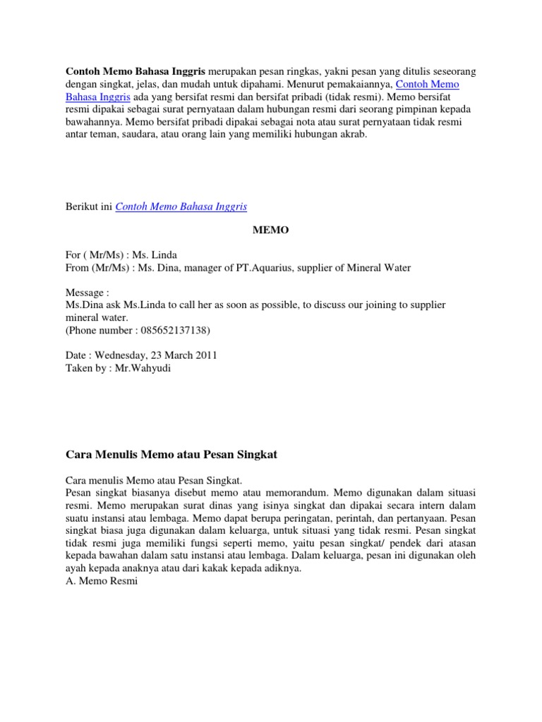 Terimakasih atas kerja keras bapak selama ini membimbing kami untuk bisa lebih memahami bahasa inggris. Sesuai dengan fungsinya, pesan singkat bentuknya pendek serta berisi informasi ringkas dan jelas. Semoga dapat membantu anda belajar berbicara joni: Dalam menulis memo, kita harus memperhatikan beberapa bagian, seperti memo adalah sebuah pesan singkat dengan bahasa yang mudah dipahami. I have an osis meeting after school. Berupa pesan singkat yang padat dan mudah dimengerti oleh penerima memo. Sesuai dengan fungsinya, pesan singkat bentuknya pendek serta berisi informasi ringkas dan jelas. Percakapan bahasa inggris yang mengandung pesan singkat yang ditujukan kepada pimpinan dibuat oleh peserta diklat pkksk otkp (otomatisasi dan tata kelola. Hal ini menyebabkan tingginya permintaan surat. Singkatan dalam bahasa inggris disebut juga abbreviations. Ria it seems that lately you are not cheerful as usual. Pesan singkat minta jemputdad, pick me up at 3 p.m. Memo memo merupakan catatan penting yang biasa ditulis untuk menyampaikan informasi secara singkat dan padat.